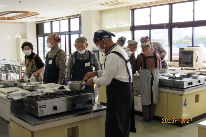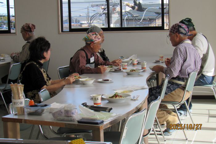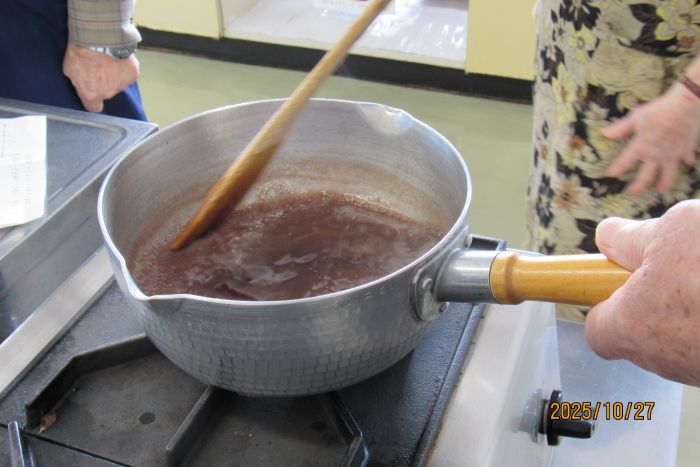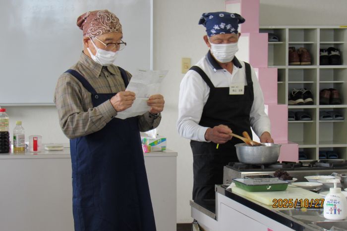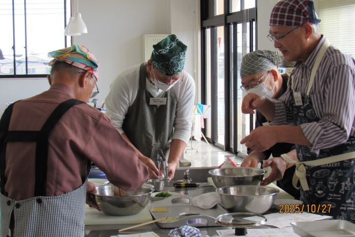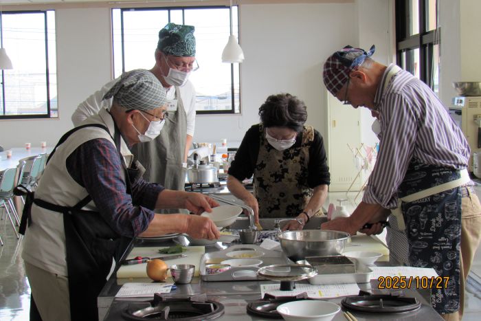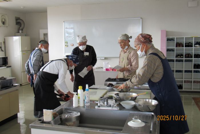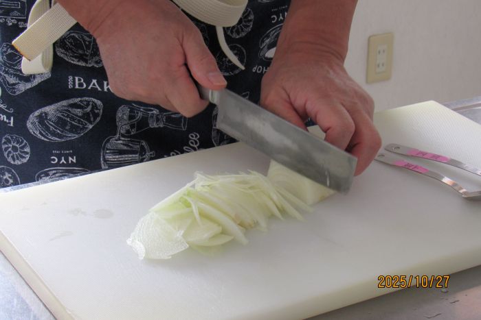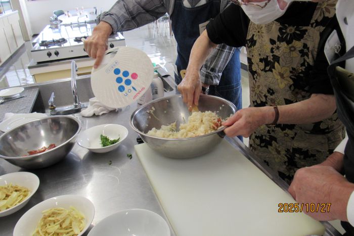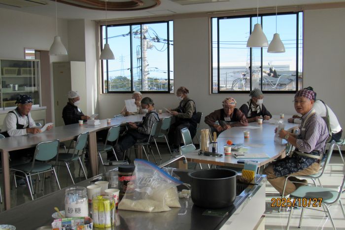 さて、本日の10月例会は料理室に暖かな日差しが入り込む中での開催となった。参加者はやや少なめの10名で、2班構成で調理にチャレンジすることとした。
