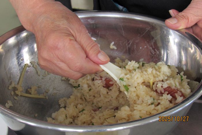 - 「手こねすし」は、本来はカツオを用いた漁師飯で、漁船の上で釣ったばかりのカツオをさばいて白米と混ぜ合わせて食べる簡単なお寿司のようだが、今回はカツオではなく、マグロを使って調理するとのこと。炊飯器で炊いた米に酢、砂糖、塩を混ぜた「合わせ酢」を回しかけて「すし飯」を作る。刺身用マグロは6mm厚さに切って、漬け汁(醤油とみりん)に15分ほど漬けておく。その後に、「すし飯」にマグロを漬けておいた「つけ汁」を加えてよく混ぜ、さらに漬けたマグロの半分ほどを加えてサックリと混ぜる。これを器に盛って、残りのマグロを載せ、その上にせん切りした「しょうが」と「青じそ」を振りかければ出来上がりである。